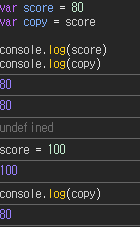 score 변수에 숫자 값 80을 할당하고, copy 변수에 score 변수를 할당했을 때